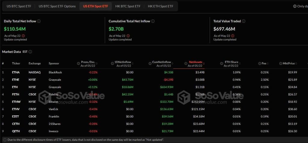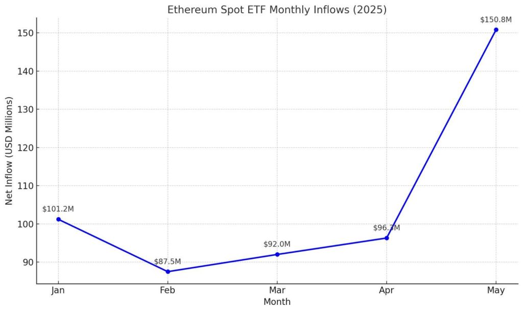 Los ETFs spot de ETH ya muestran un incremento de casi 49% en lo que va del año (YTD). La demanda acumulada en mayo ha superado los niveles de enero, lo que refleja el creciente interés institucional en Ethereum como activo digital.