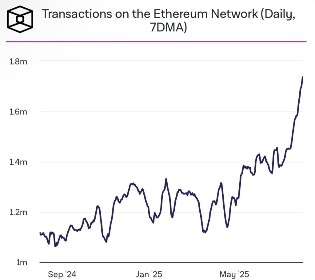 El 5 de agosto, Ethereum registró un promedio móvil de siete días de 1,74 millones de transacciones diarias, rompiendo el récord anterior de 1,65 millones establecido el 12 de mayo de 2021, según datos de The Block. Solo en julio, la red procesó 46,67 millones de transacciones, el mayor volumen mensual en su historia.