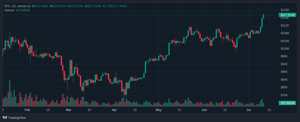 Bitcoin continuó su racha alcista superando los USD 112.000 el jueves y alcanzando casi USD 118.000 al cierre de esta edición, con un repunte de alrededor del 6% en las últimas 24 horas.